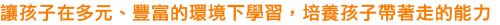 在三之三的幼兒園裡,強調孩子多元發展,透過主題活動,養成孩子自發性探索的能力;利用閱讀,奠定孩子學習的廣度;發展才藝活動,建構孩子多元的興趣。培養一個快樂、自信具有多元能力的孩子,是我們的目標。